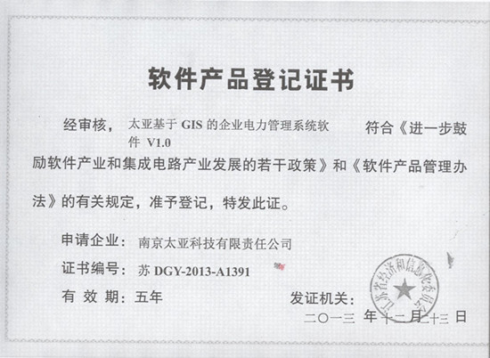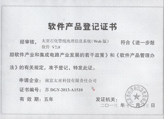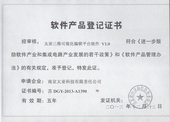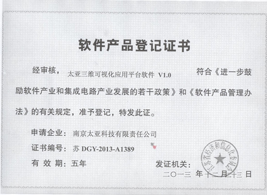 2013年12月,由南京太亞科技自主研發(fā)的《太亞三維可視化應用平臺軟件 V1.0 》《太亞三維可視化編輯平臺軟件 V1.0 》《太亞基于GIS的企業(yè)電力管理系統(tǒng)軟件 V1.0 》《太亞石化管線地理信息系統(tǒng)(Web版)軟件V2.0》經過工信部核查、檢測,最終獲得了軟件產品登記證書。